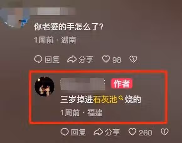 有人發現甜妹的雙手似乎都有殘障,就詢問丈夫到底怎麼回事,隨後博主就在評論區回復,表示妻子的雙手是在三歲的時候不小心掉進石灰池裡燒壞的。