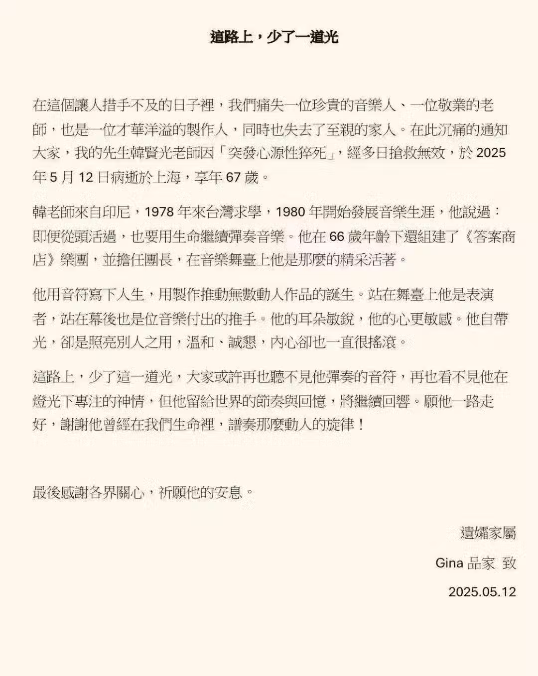 遺孀隨後發布訃告稱「這路上,少了這一道光,大家或許再也聽不見他彈奏的音符,再也看不見他在燈光下專注的神情,但他留給世界的節奏與回憶,將繼續迴響...」