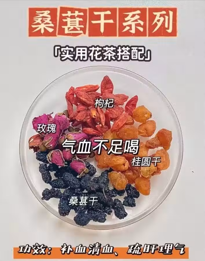 4、桑葚干+玫瑰+枸杞+桂圓乾(氣血不足喝)