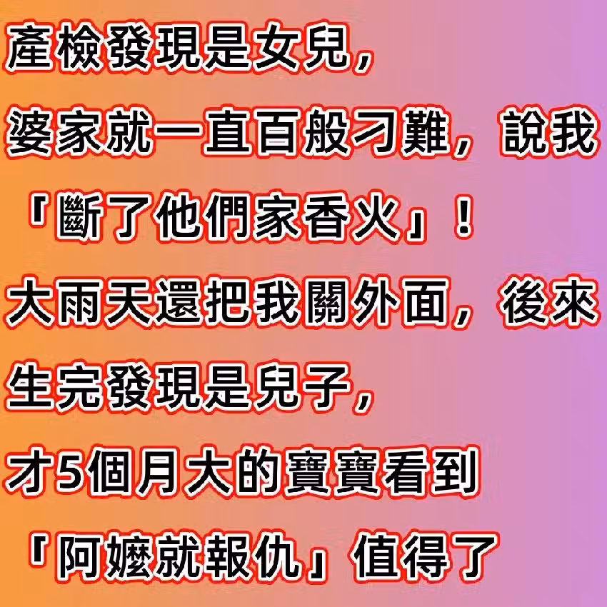 產檢發現是女兒, 婆家就一直百般刁難,說我 「斷了他們家香火」! 大雨天還把我關外面,後來生完發現是兒子, 才5個月大的寶寶看到 「阿嬤就報仇」值得了