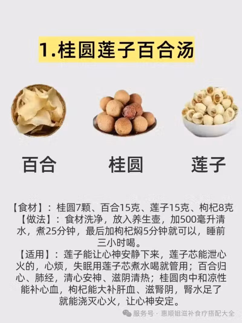 ✅️桂圓蓮子百合湯:寧心安神,改善睡眠。