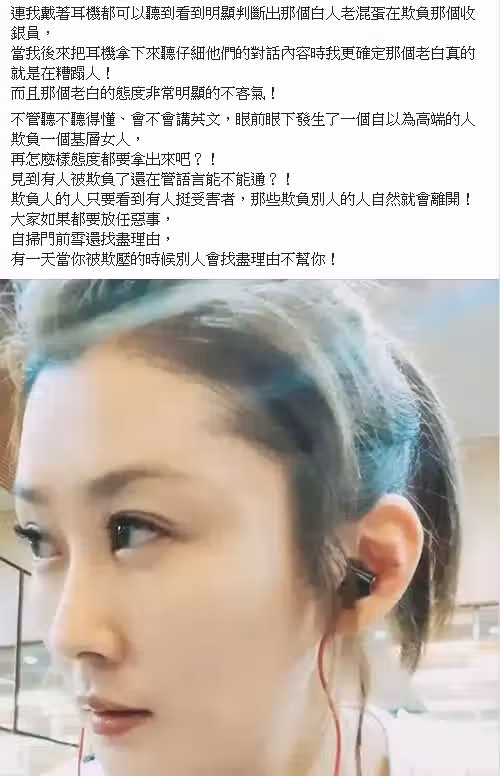 她最後表示,希望大家看到有人被欺負的時候,無論是男人、女人,也不要分國籍,一定要站出來為正義發聲:「不能像排隊在我前面的那位台灣男子,眼睜睜的看著弱勢被鼻孔朝天、自視甚高的混蛋欺負!」
