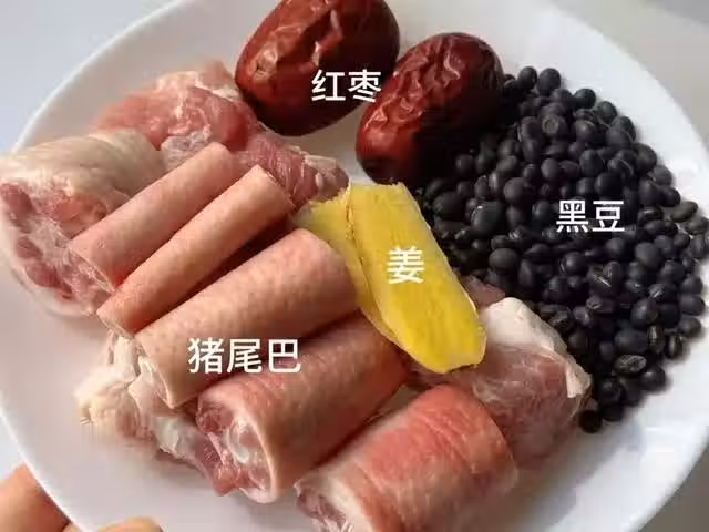 黑豆半碗,紅棗2粒,豬尾巴一條,兩片薑片