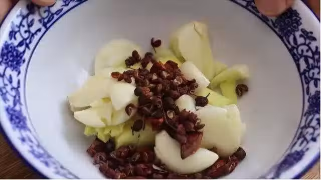 幾瓣大蒜,用刀拍扁,然後一起放入碗中。
