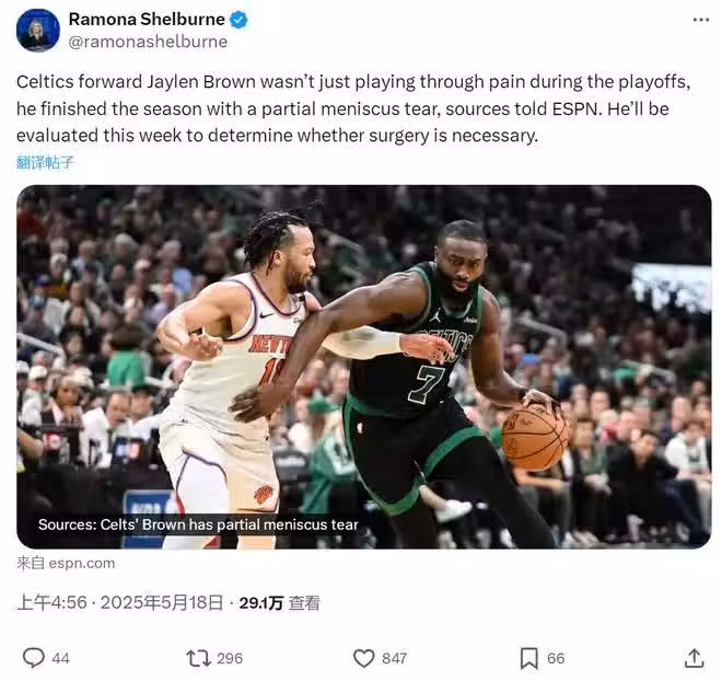 5月18日,ESPN記者Ramona Shelburne報道,凱爾特人前鋒杰倫-布朗遭遇半月板部分撕裂,本周將評估是否接受手術。布朗在季後賽場均22.1分7.1籃板3.9助攻1搶斷3.6失誤,三項命中率:44.1%,33.3%,75.8%。