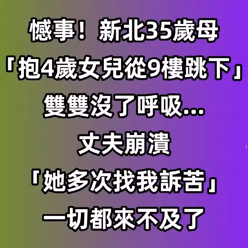 憾事!新北35歲母「抱4歲女兒從9樓跳下」雙雙沒了呼吸...丈夫崩潰「她多次找我訴苦」一切都來不及了 #阿彌陀佛  #一路好走