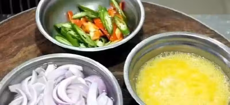 3,另起鍋添油,倒入青紅辣椒翻炒幾下,放入洋蔥,快速翻炒片刻。