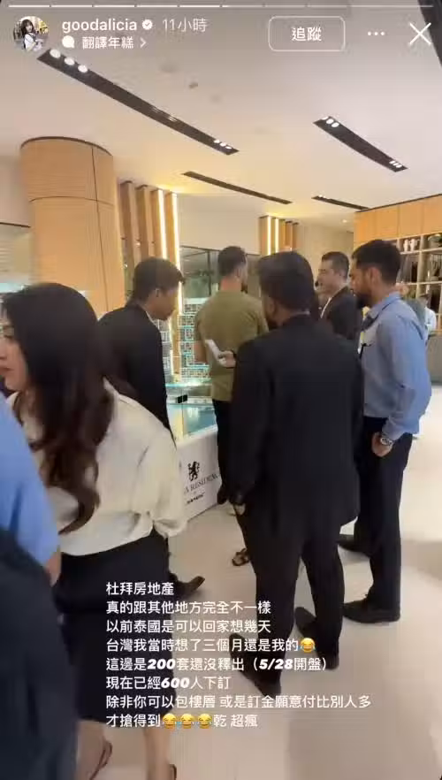 愛莉莎莎今日在IG限時動態上分享在杜拜看房的過程,透露當地買房與其他國家很不一樣,以前在泰國看房子可以回家想幾天,在台灣就算過了3個月還是可以買到心儀的房子,但杜拜的房子卻十分搶手,「這邊是200套還沒釋出(5/28開盤),現在已經600人下訂,除非你可以包樓層,或是訂金願意付比別人多才搶得到,超瘋」。