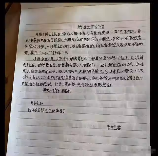 他出事的那天,叫我跟他一起去輝哥家吃飯,要是那天我沒有拒絕,就不會發生這樣的事情...2020年8月8日是滿哥離開的那天,我把所有密碼都設置了這個,也包括手機的密碼,如有下輩子,我一定會好好孝敬你們」然而,隨著第二封信的出現,簡短的兩句話:「我走了,認識你們我很開心,我真的活不下去了,所以後會無期。