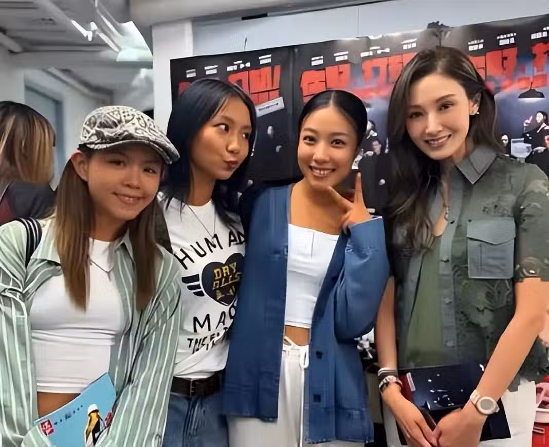 當時露面的李嘉欣也是港風裝扮,55歲的她與年輕靚妹們一起合影絲毫不落下風。