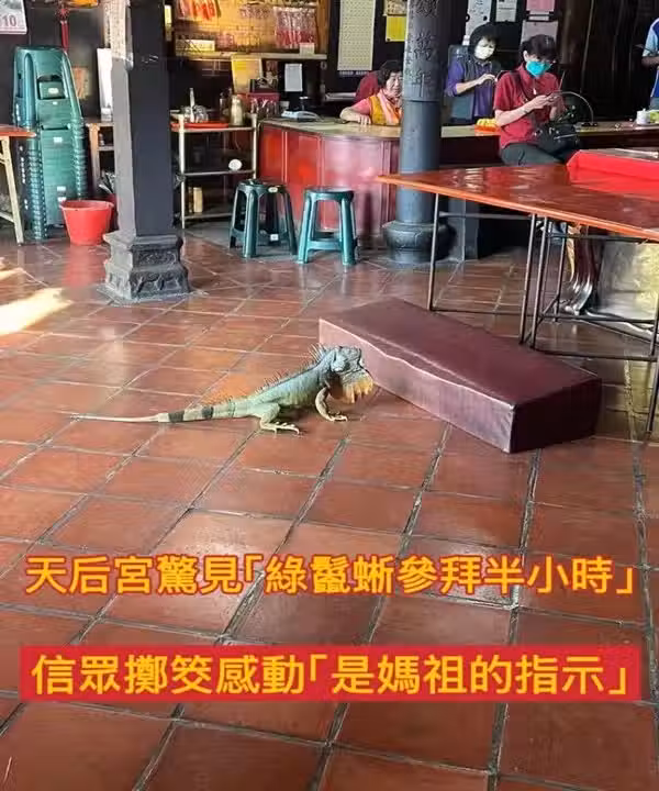 天后宮驚見「綠鬣蜥參拜半小時」 信眾擲筊感動「是媽祖的指示」