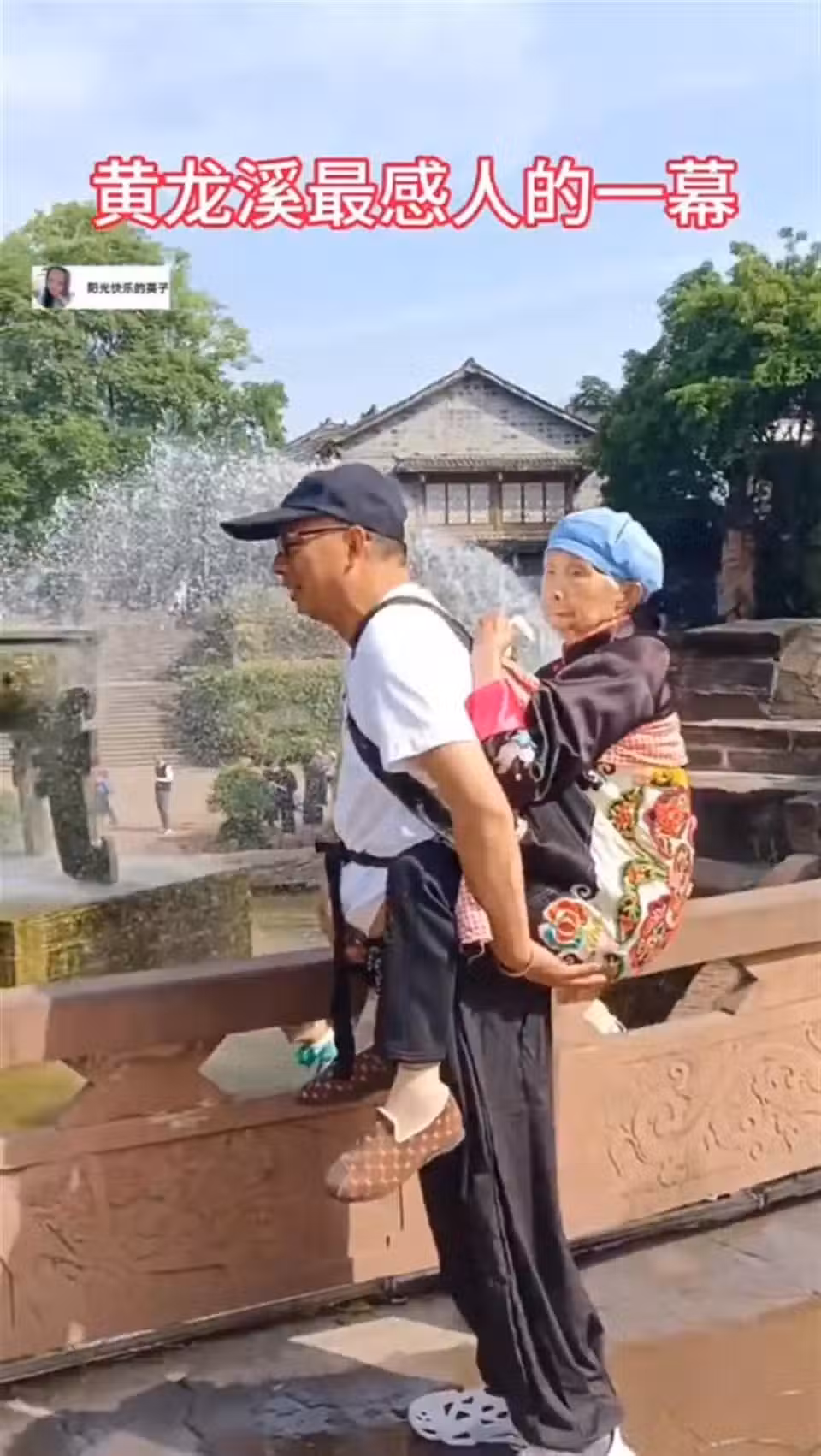 英子在朋友圈配文稱:今年五一節,黃龍溪最感人的一幕,兒子背著母親遊玩黃龍溪,這真印證了一句話:父母養我們小,我們陪父母到老。