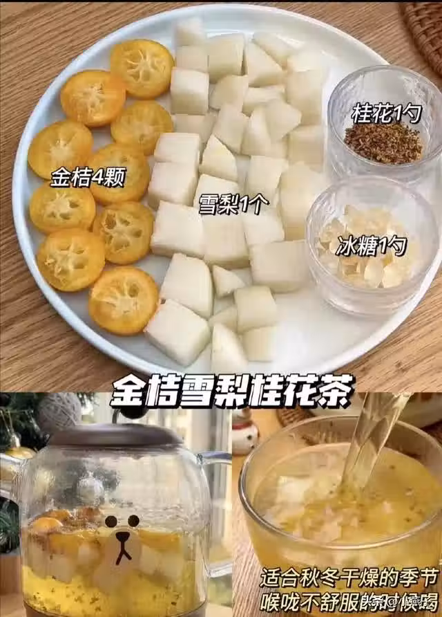 配方:金桔4顆+雪梨1個+桂花1勺+冰糖1勺。