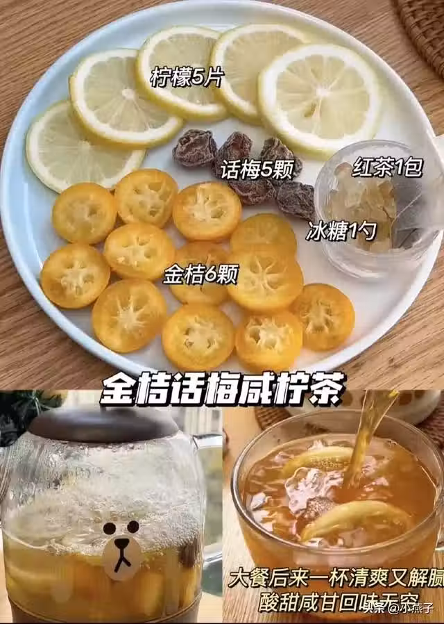配方:金桔6顆+檸檬5片+話梅5顆+紅茶1包+冰糖1勺。