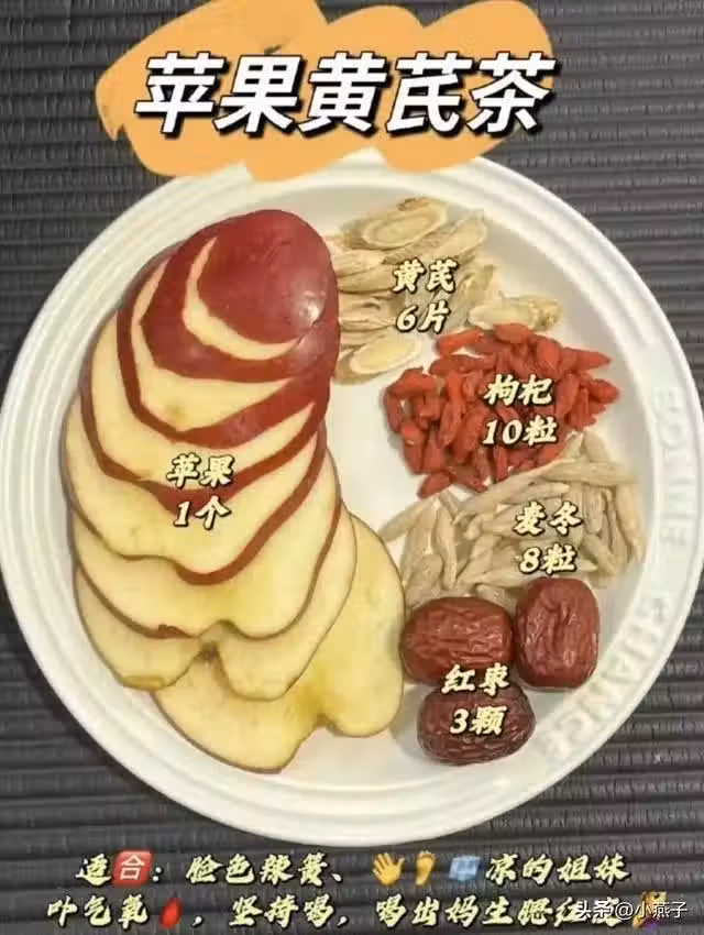 食材:黃芪6片+枸杞10粒+麥冬8粒+紅棗3顆+蘋果1個。