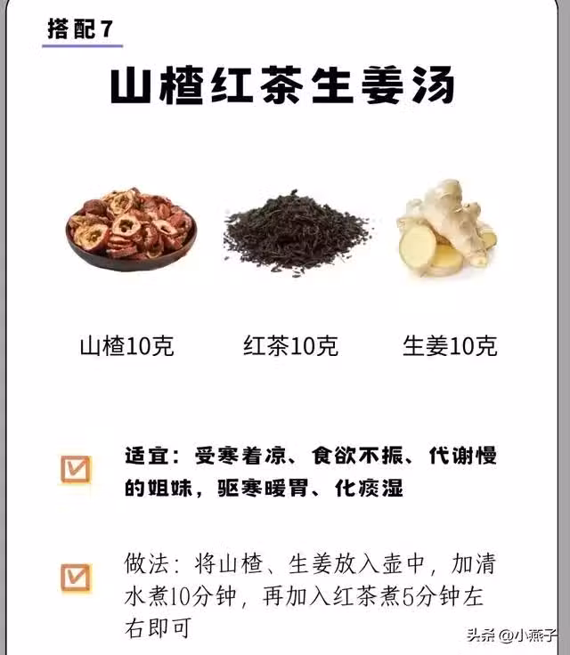 食材:山楂10g+紅茶10g+生薑10g。