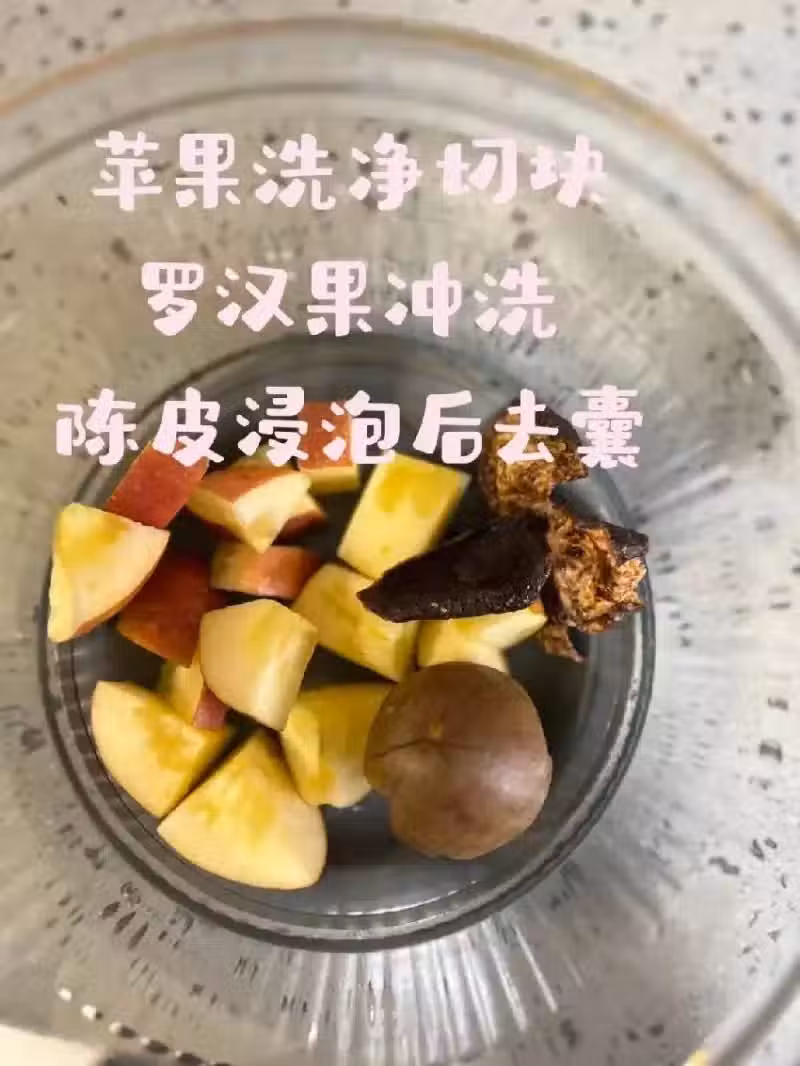 準備食材: 將陳皮用清水沖洗乾淨,浸泡5-10分鐘去除表面雜質;羅漢果清洗後輕輕捏碎(殼也可以一起煮,營養更豐富);蘋果切塊,去核備用。