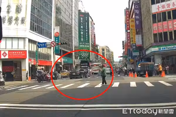 事發當下,路口燈號正由綠轉紅,其他車輛都已依規定停下,行人也開始過馬路。