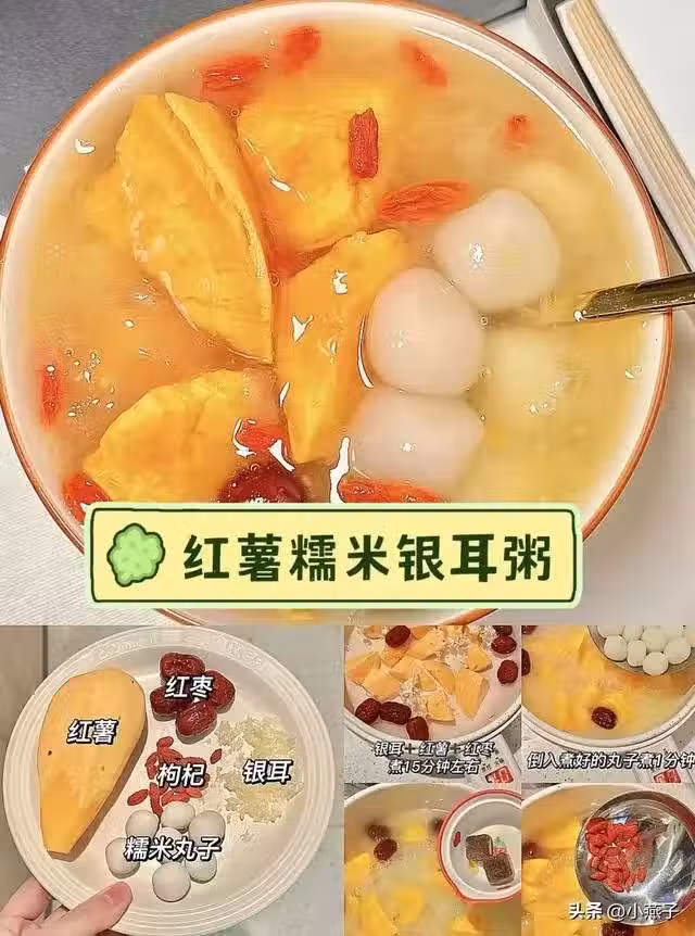 做法:銀耳+紅薯+紅棗煮15分鐘→加煮好的糯米丸子煮1分鐘。