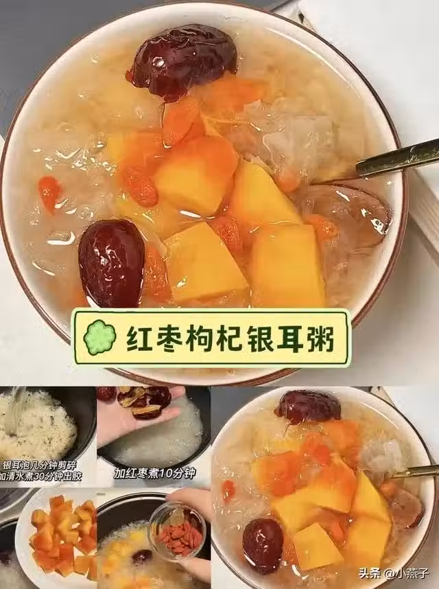 做法:銀耳泡軟剪碎煮30分鐘出膠→加紅棗煮10分鐘→撒枸杞。
