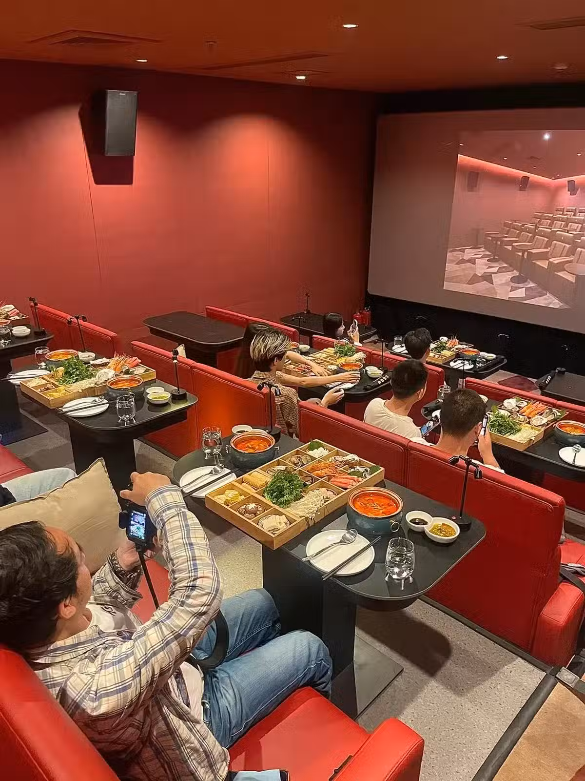 小紅書一位名叫「@Long龍井」的網友在貼文中曬出許多照片,從畫面中可以看到,背景為電影院,有不少民眾正在觀賞電影,每張沙發的前方都擺著一張桌子,而桌子上有許多大大小小的碗盤……