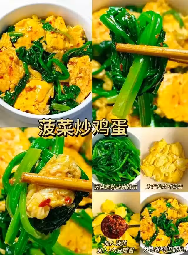 食材:菠菜200g+雞蛋2個+豆瓣醬1勺。
