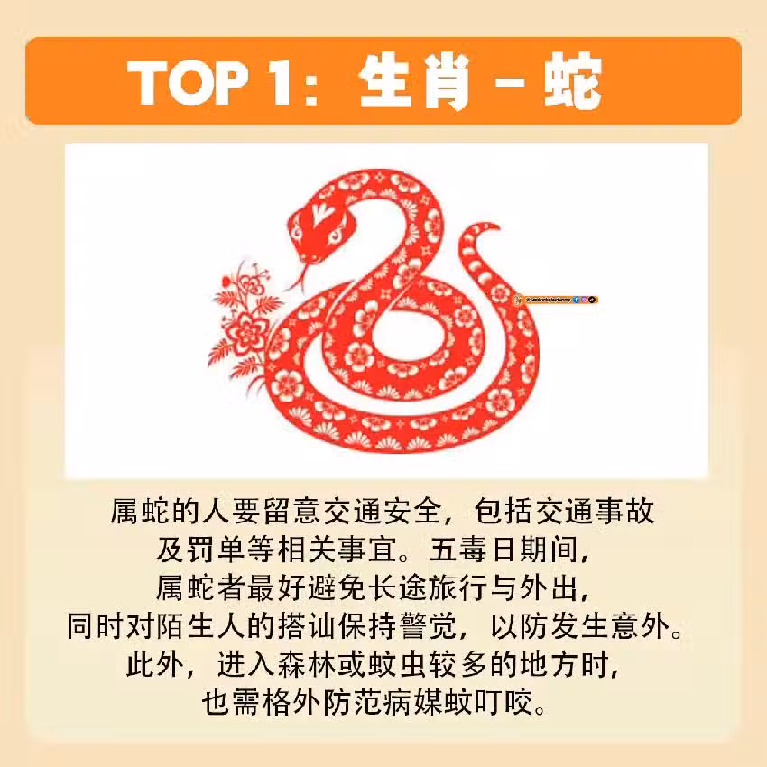 五毒日期間,屬蛇者最好避免長途旅行與外出,同時對陌生人的搭訕保持警覺,以防發生意外。