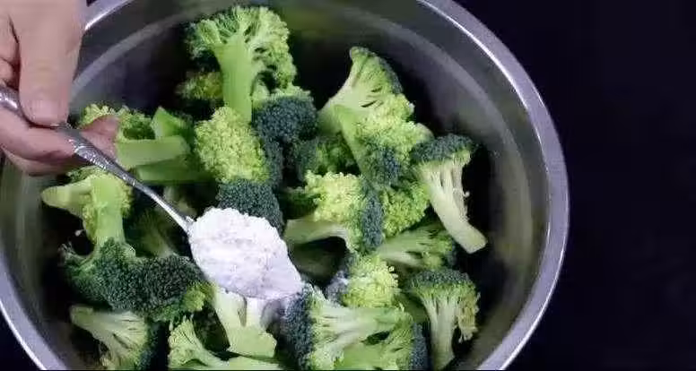 小蘇打、麵粉都充分的溶解在水中。攪拌溶解後,就讓西蘭花在這個水中浸泡上十分鐘。