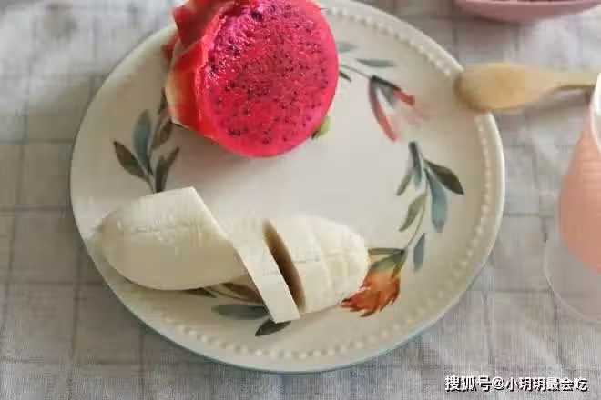 1.步驟1、紅心火龍果對半切開,今天用半個即可。蘋果蕉一個去皮,一半切片,一半準備打奶昔。