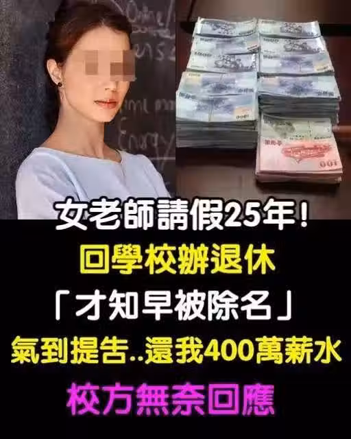 女老師請假25年!回學校辦退休「才知早被除名」氣到提告「還我400萬薪水」校方無奈回應!
