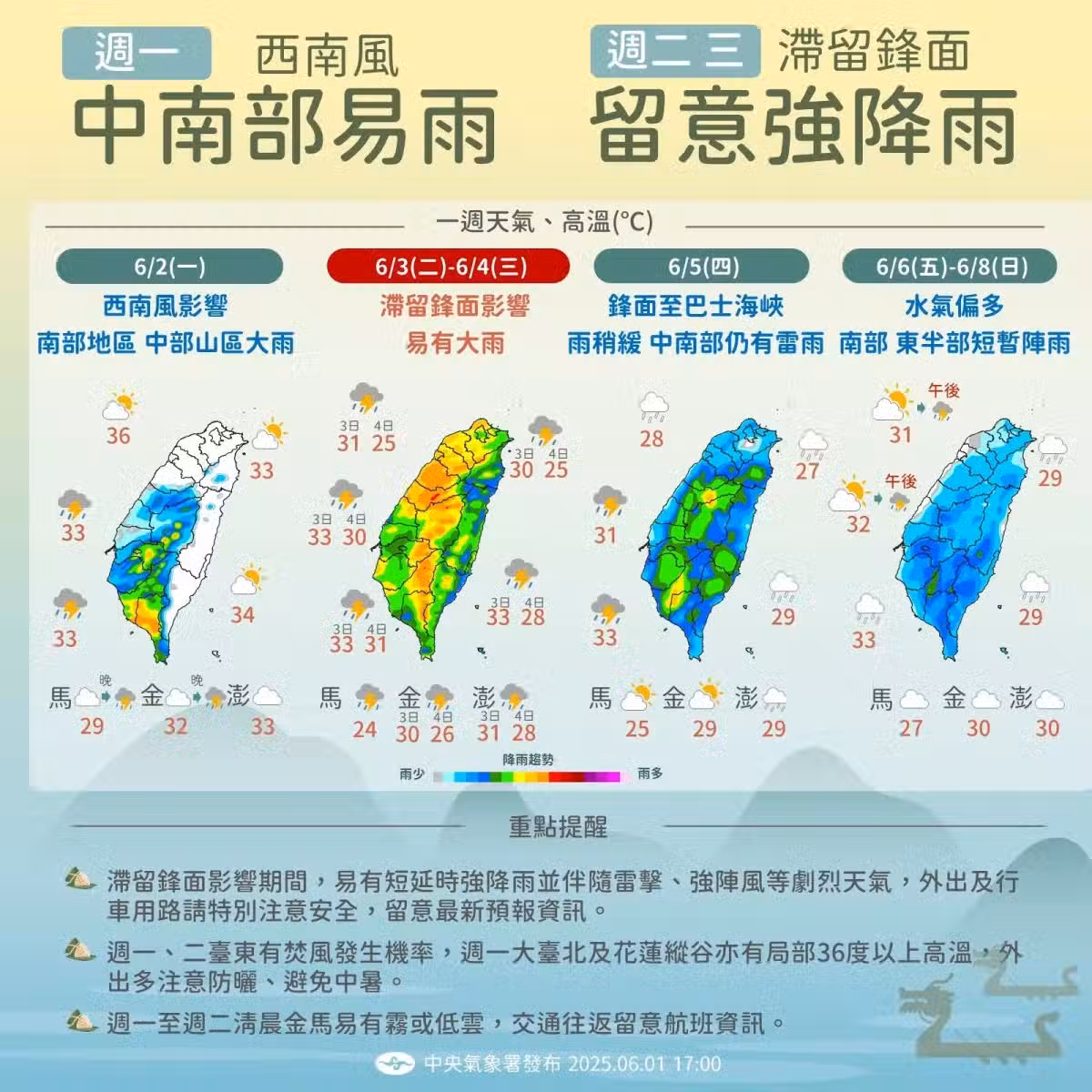 氣象單位同時提醒,今天清晨到明天晚上,新北、桃園、新竹、苗栗、台中、屏東、宜蘭、台東等九個縣市的部分地區,平均風力可能達到六級,陣風更可能超過八級,民眾外出要特別小心。接下來幾天的天氣型態將逐步轉變,明後兩天滯留鋒面影響,全台各地都可能出現短延時強降雨。明天西部地區將有短暫陣雨或雷雨,其他區域也會轉為局部性降雨,西半部和各地山區需要提防局部大雨。