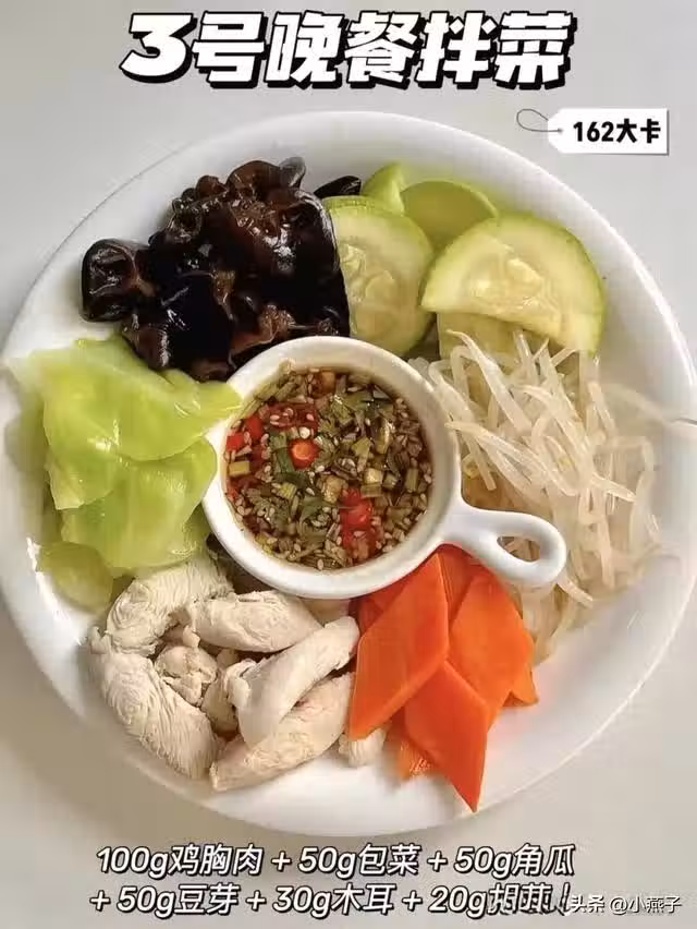 食材:100g雞胸肉+50g包菜+50g角瓜+50g豆芽+30g木耳+20g香菜。