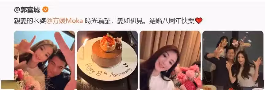 轉眼兩人結婚已 8 周年,早前兩人在社交網大秀恩愛,郭富城曬出合照表白,方媛則回應:「八年不是把愛過成習慣,而是把習慣過成新的心動~」