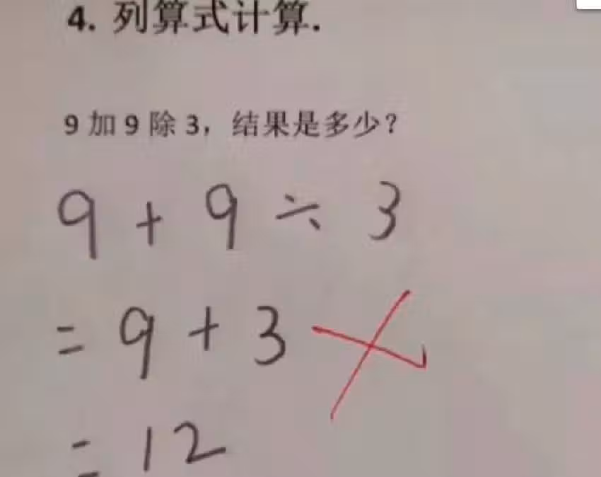三年級小學生數學題,「9+9÷3=12」被打叉,質問老師反被打臉