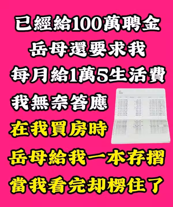 剩餘的那70萬,准岳母說,是這麼多年,她供女友讀書的辛苦費「阿姨,又有什麼事?」我心裡忐忑地問,畢竟那些條件已經惹得我爸媽非常不高興了「是這樣,我這裡有份協議,你簽一下」說著,准岳母遞給我一張紙。