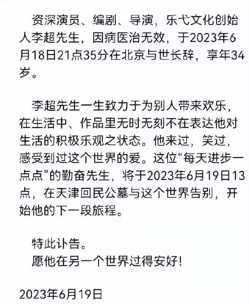 而他的親友也悲痛證實噩耗「驚天噩耗,肝腸寸斷。