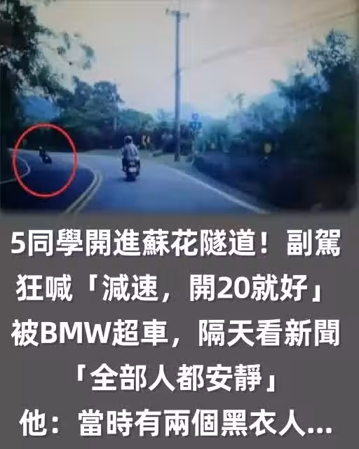 5位同學開車進蘇花隧道!副駕狂喊「減速,開20就好」被隨尾的BMW超車,隔天看新聞「全部人都安靜」他:當時有兩個黑衣人。。。