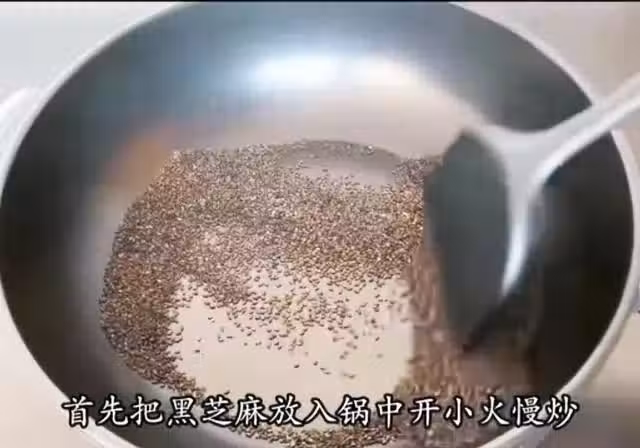 炒干以後裝進塑料袋,然後用擀麵杖開會碾壓,把黑芝麻壓碎。