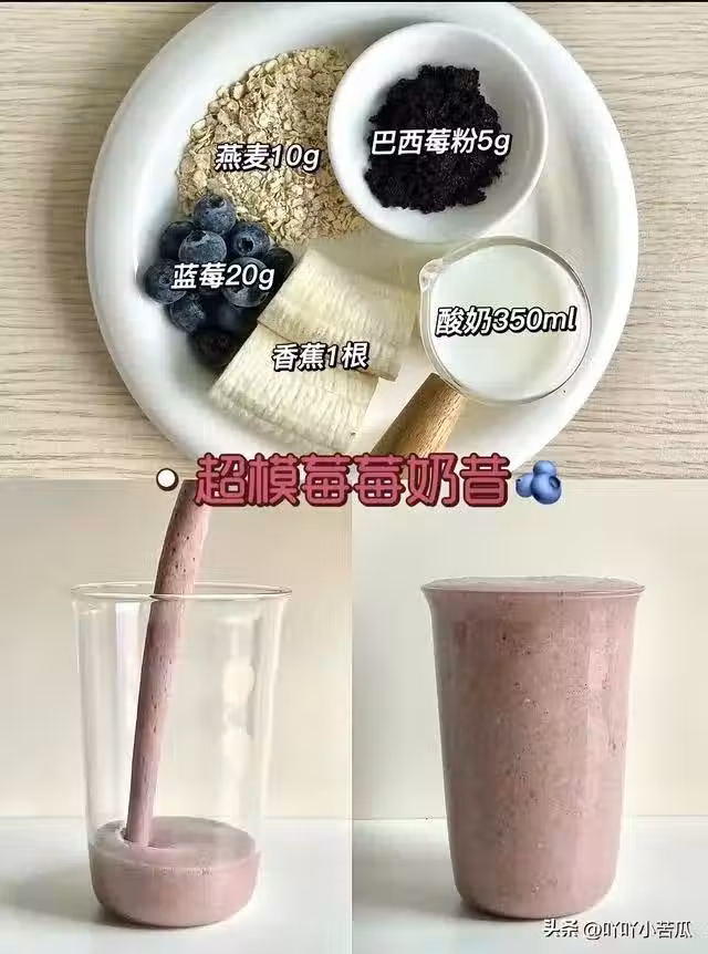 食材:藍莓20g+巴西莓粉5g+酸奶350ml+燕麥10g+香蕉1根。