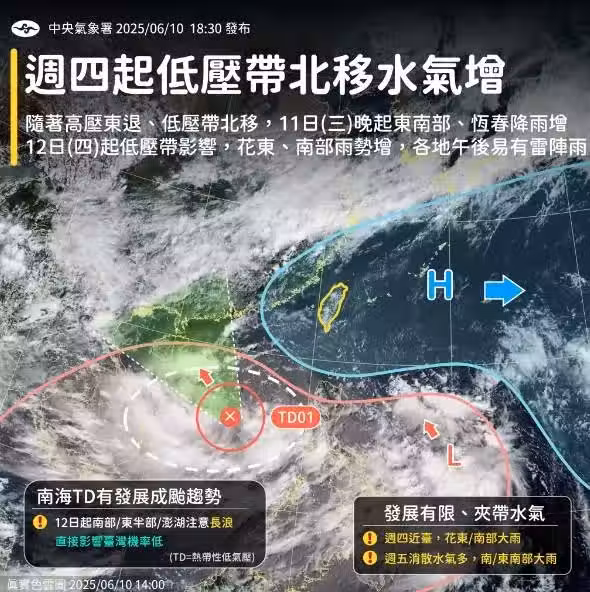 張承傳提到,周六低壓帶影響,中南部有短暫陣雨或雷雨,並有局部大雨機率,其他地區午後有局部短暫雷陣雨,山區並有局部大雨機率;周日到下周二西南風影響,中南部有局部短暫陣雨或雷雨,其他地區午後有局部短暫雷陣雨。