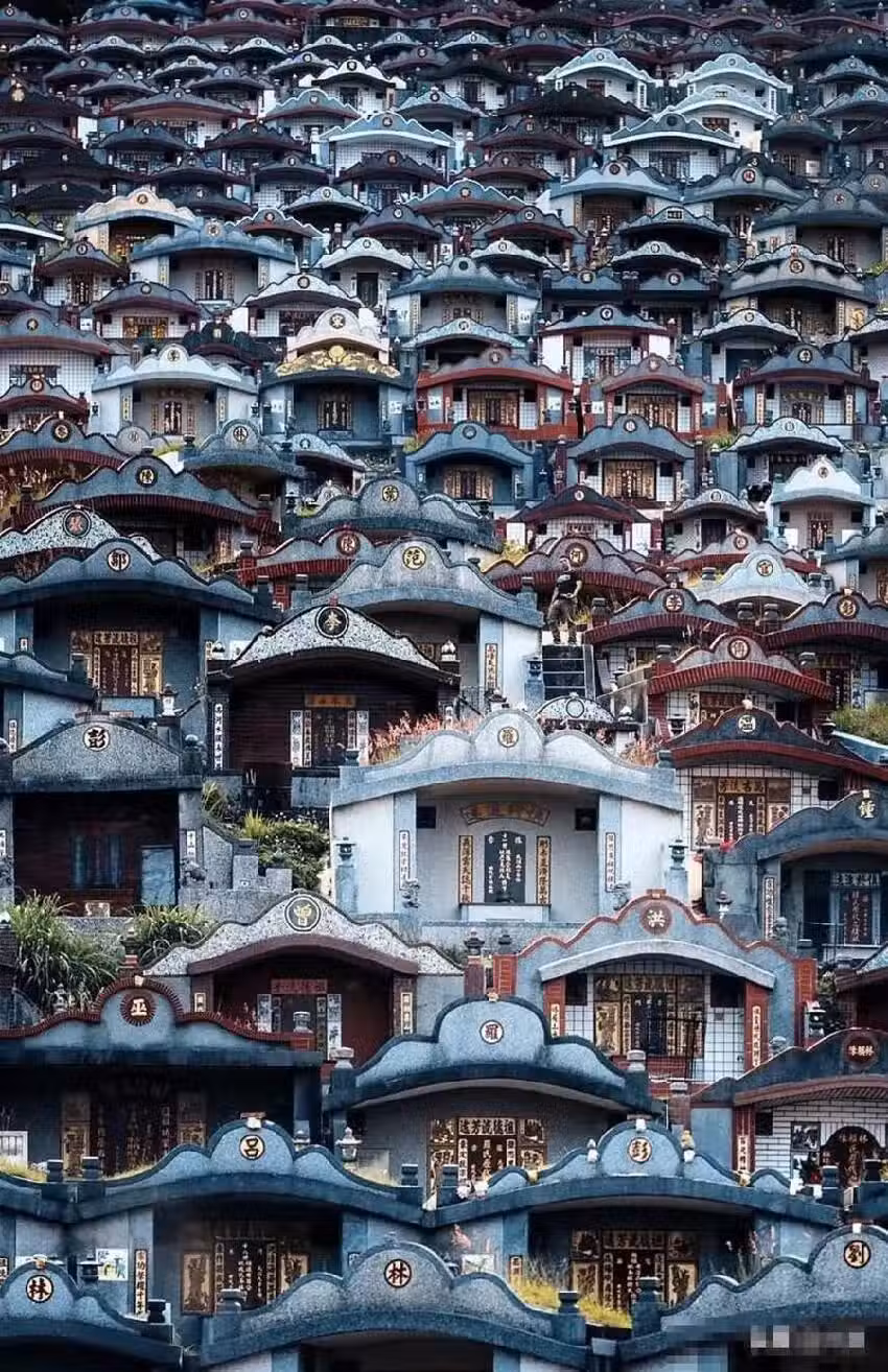 照片中的墓園規模宏大,層層疊疊的墓碑與墓室排列得極為緊湊,灰紅相間的屋頂、金色的裝飾文字,以及波浪形的東亞風格建築,構成了一幅既壯觀又肅穆的畫面。
