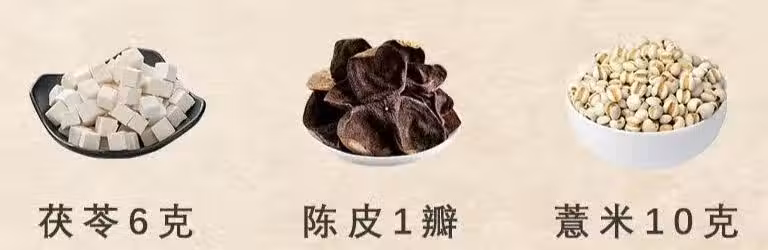 亮點:陳皮理氣化痰,薏米健脾祛濕,茯苓增強運化。薏米提前炒黃去寒氣,煮水或煮粥,每周3次。