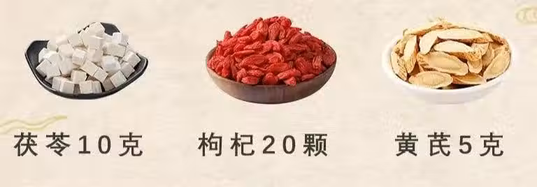 亮點:黃芪大補元氣,枸杞滋陰,茯苓健脾防滋膩。黃芪10g+茯苓10g煮20分鐘,加枸杞燜5分鐘,代茶頻飲。