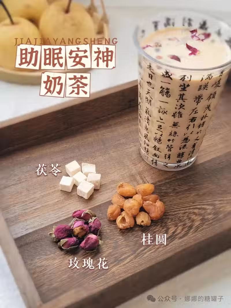茯苓:味甘、淡,性平,歸心、肺、脾、腎經 。能寧心安神,其含有的多糖、三萜類等成分,可調節神經系統,緩解焦慮、失眠等情況。 玫瑰花:味甘、微苦,性溫,歸肝、脾經。有疏肝理氣之效,情緒不佳、肝鬱氣滯導致失眠時,它可舒緩情緒,間接幫助入眠 ,其含有的揮髮油等成分有助於放鬆身心。 桂圓:味甘,性溫,歸心、脾經 。能補益心脾、養血安神,對心脾兩虛引起的失眠、健忘、驚悸等有幫助,富含的葡萄糖、蔗糖等能補充大腦能量,改善睡眠。