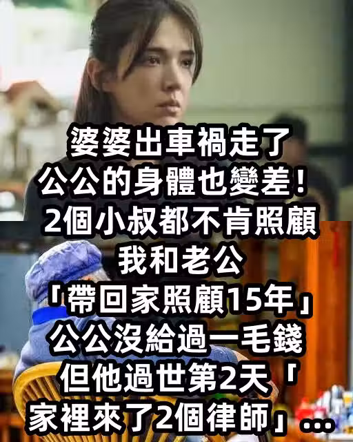 婆婆出交通事故走了公公的身體也變差! 2個小叔都不肯照顧,我和老公「帶回家照顧15年」公公沒給過一毛錢 但他過世第2天「家裡來了2個律師~」
