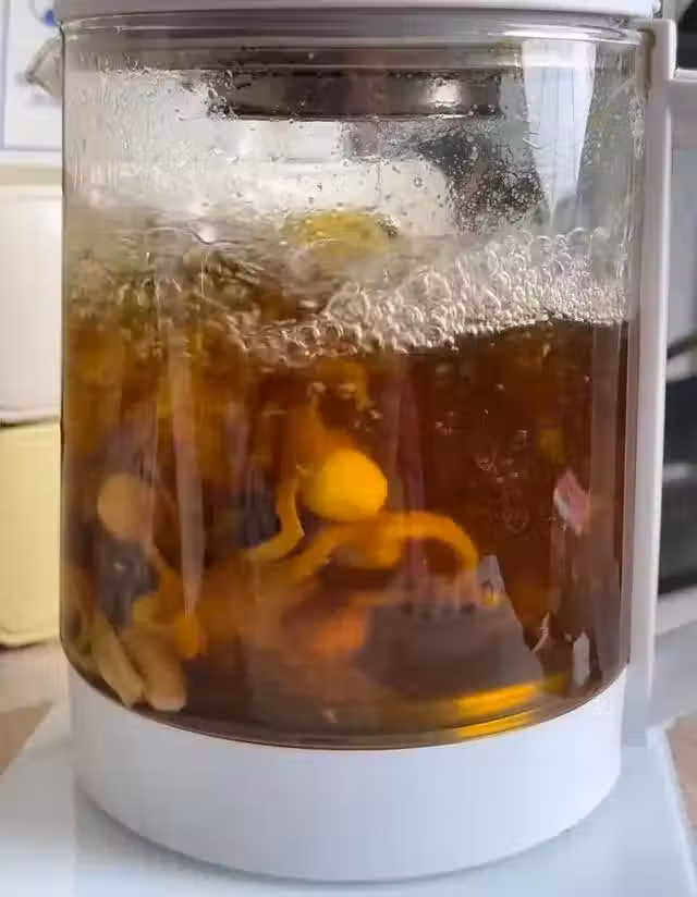 ◦ 加入陳皮再煮10分鐘,加冰糖調味即可。