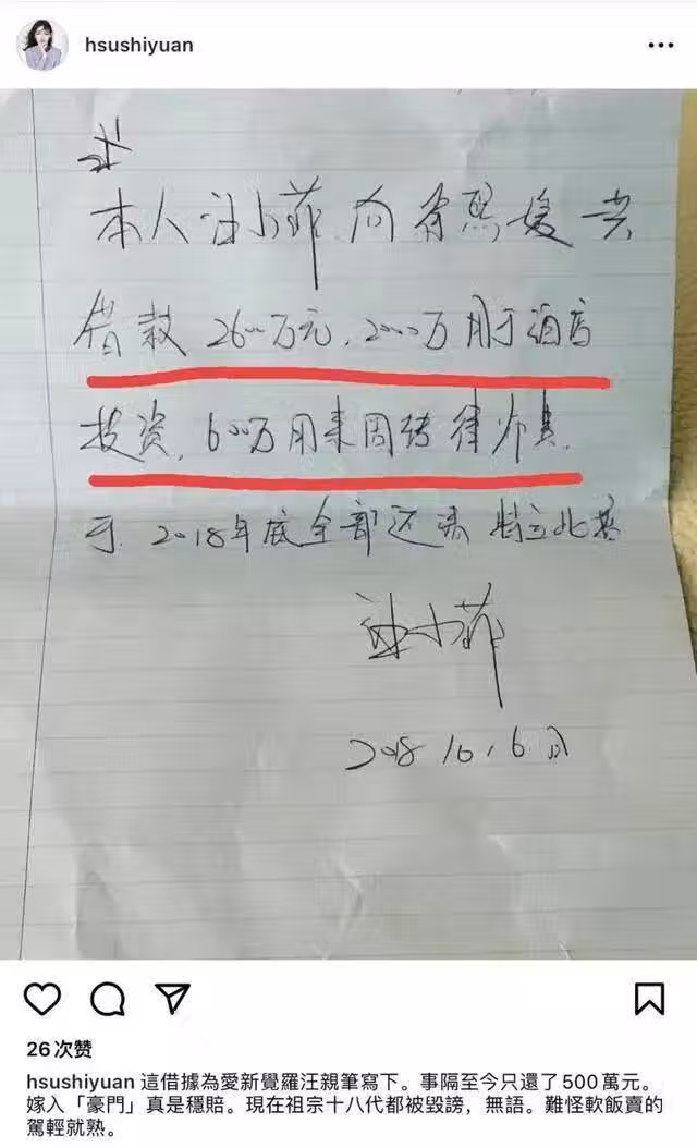 離婚後,兩人的財產糾紛和撫養權問題不斷引發爭議,大S更是曬出了汪小菲向她借款的2600萬欠條。