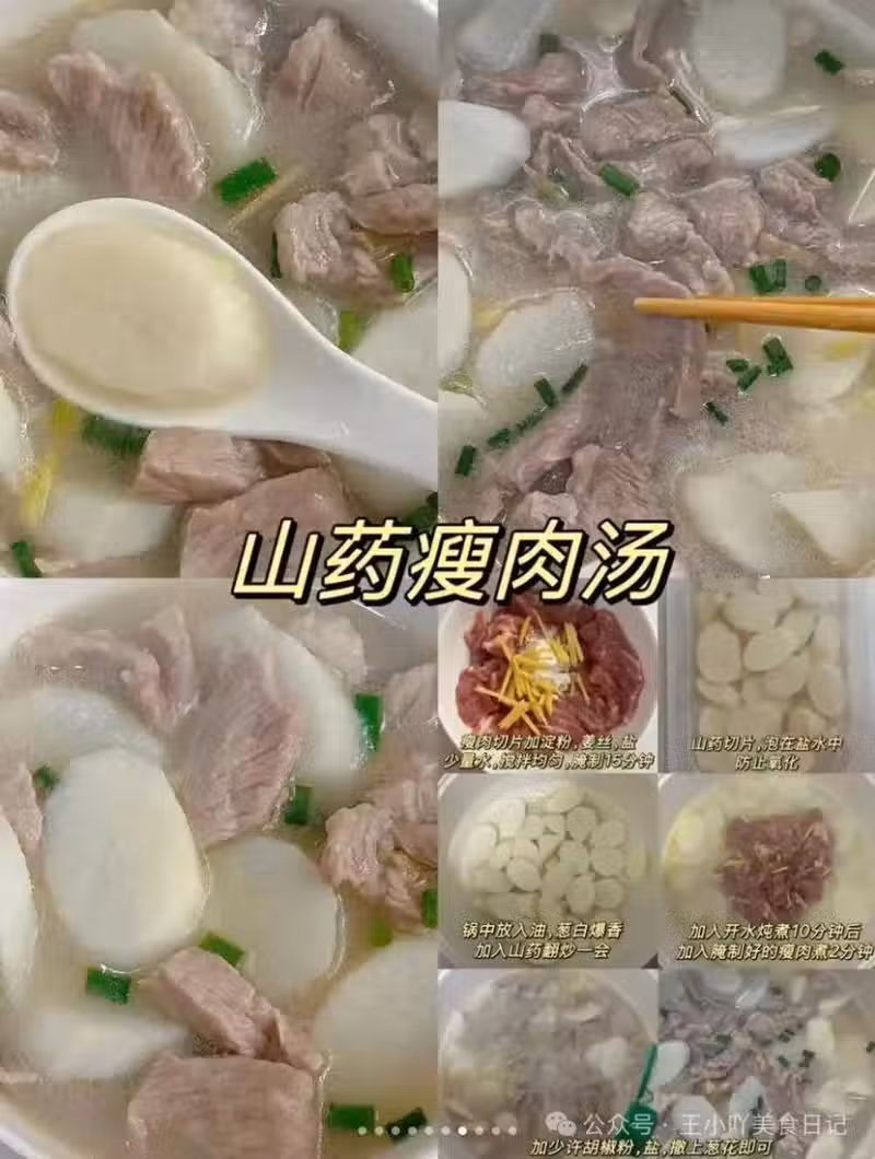 食材處理:瘦肉洗凈,切成薄片,放入碗中。加入適量澱粉、薑絲、鹽和少量水,攪拌均勻,腌制15 分鐘。山藥洗凈去皮,切成薄片,泡在鹽水中防止氧化。