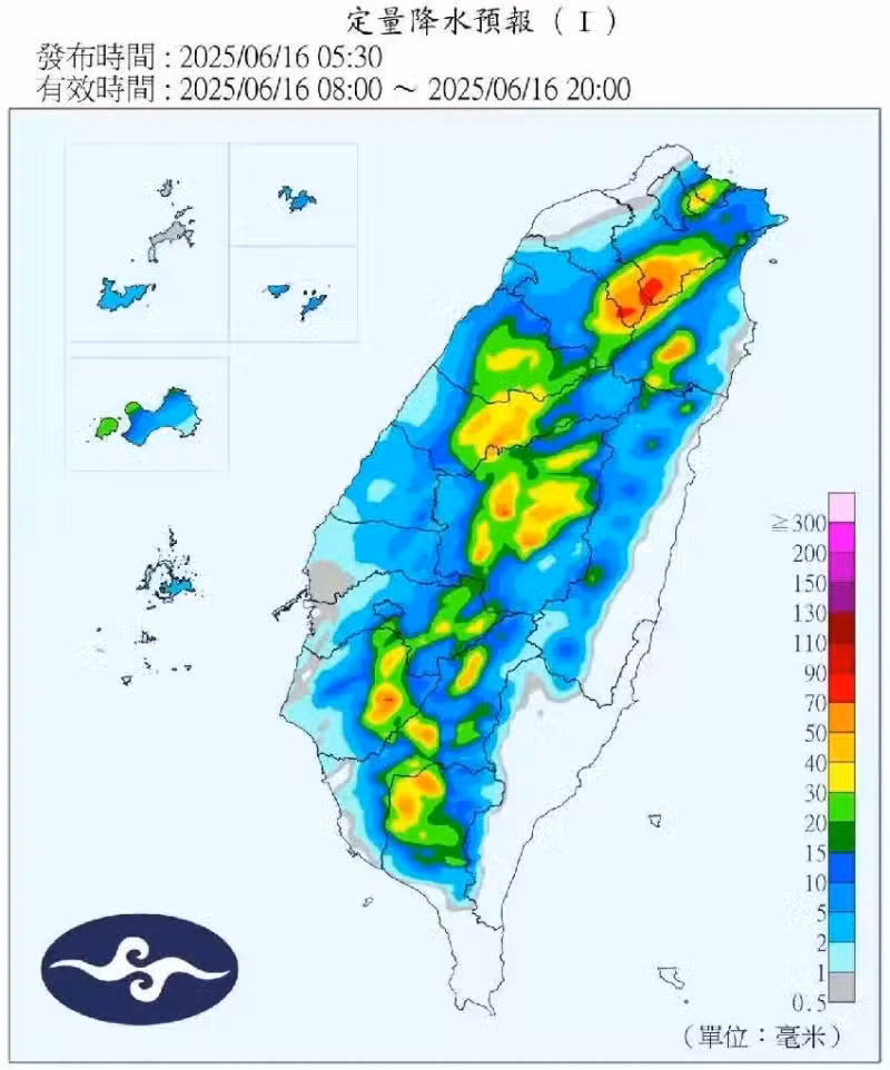 午後各地有局部短暫雷陣雨,其中在北部、西半部、東北部山區有局部大雨機率。