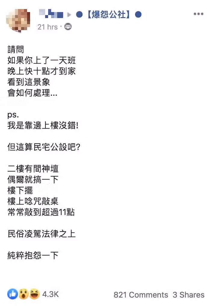 對此,他感到非常疑惑,不明白那究竟是做什麼用的,於是趕緊上網求助,「看到這景象該如何處理?」而許多網友看完後,也和他一樣覺得不舒服,留言說:「擺在公寓樓下大門也不太好吧」、「不是擋不擋路的問題吧!明明就是會被嚇到」、「就尊重別去想那麼多,然後直接上樓不要回頭、也不要偷瞄」、「我會有點不開心欸,可是又好像不太好跟鄰居說什麼」。